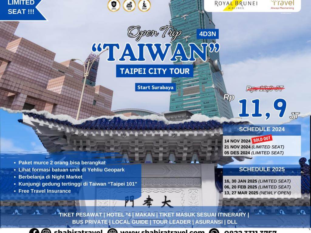 CKS Memorial Hall, Ximending Night Market, Yehliu Geopark, Shinfen Skylantern, Taipe Night Market, Pineapple Tart, Taipei 101 (photo stop), Zaoher Night Market.