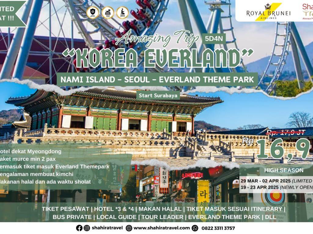 Kimchi Making School + Hanbok Studio, Nami island, Starfield Library COEX, National Ginseng Outlet Cosmetic Shop, The Blue House (passing by),Gyeongbok Palace, National Folklore Museum, Bukchon Hanok Village, Duty Free Shop, Myeongdong Street, Red Pine Tree Shop, Amethyst Show Case, Everland Themepark one day pass, Dongdaemun Market, Grocery Shop