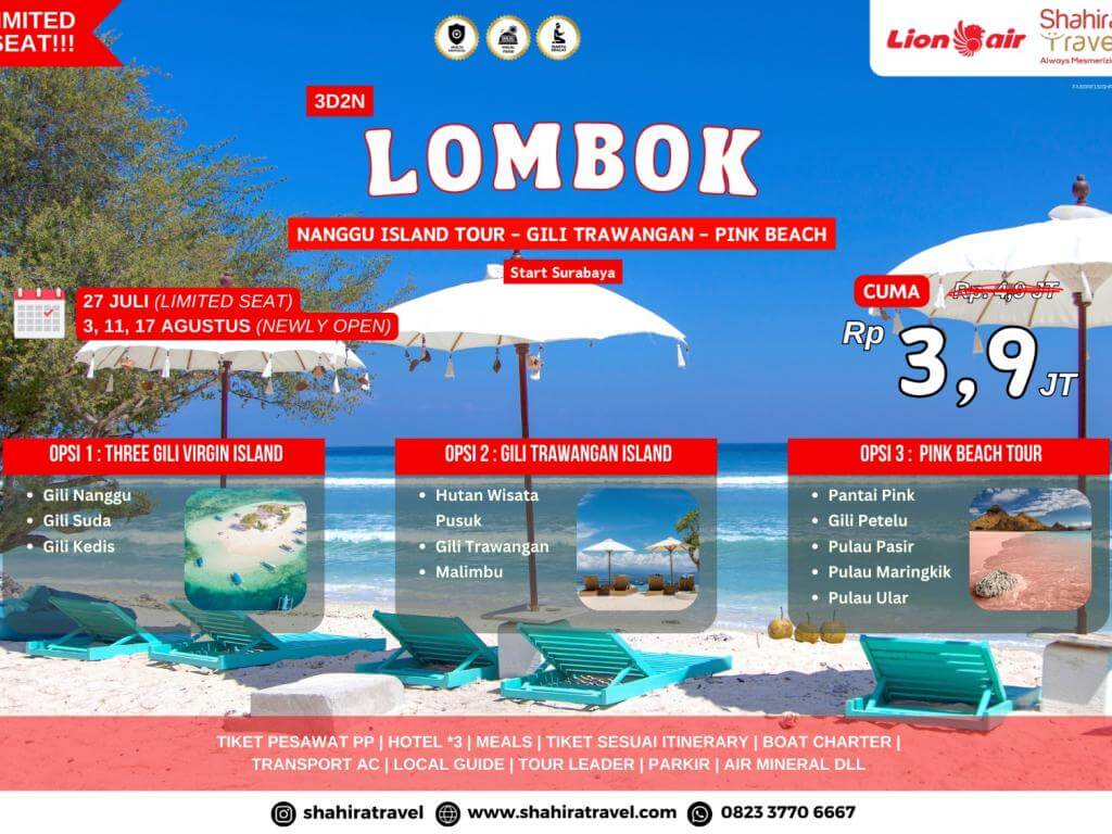 OPSI 3 : Pantai Pink/Tangsi, Gili Petelu (Snorkeling), Pulau Pasir, Pulau Maringkik, Pulau Ular