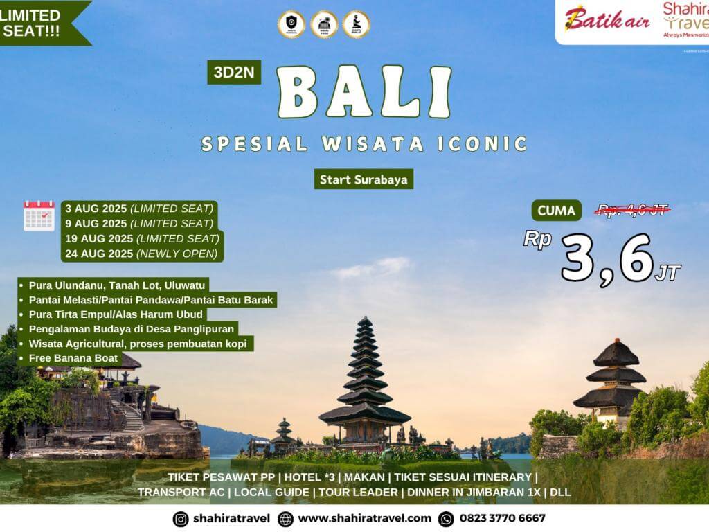 The Bloosom Garden/Handara Gate, Pura Ulundanu Bedugul, Jungle Gold/Secret Garden, Pura Tanah Lot, Desa Penglipuran, Kintamani, Wisata Agricultural, Pura Tirta Empul/Alas Harum Ubud, Free Banana Boat, Pantai Melasti / Pantai Pandawa / Pantai Batu Barak, Pura Uluwatu, Shopping Oleh Oleh Khas Bali.