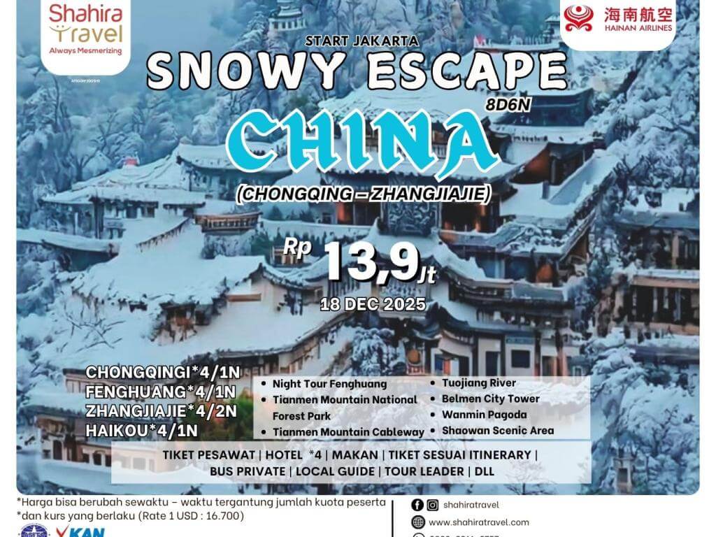 - Group akan diberangkatkan apabila mencapai jumlah minimum peserta. Jika kurang dari minimum peserta, Shahira Travel berhak melakukan penyesuaian harga tour / mengganti tanggal keberangkatan / membatalkan keberangkatan.