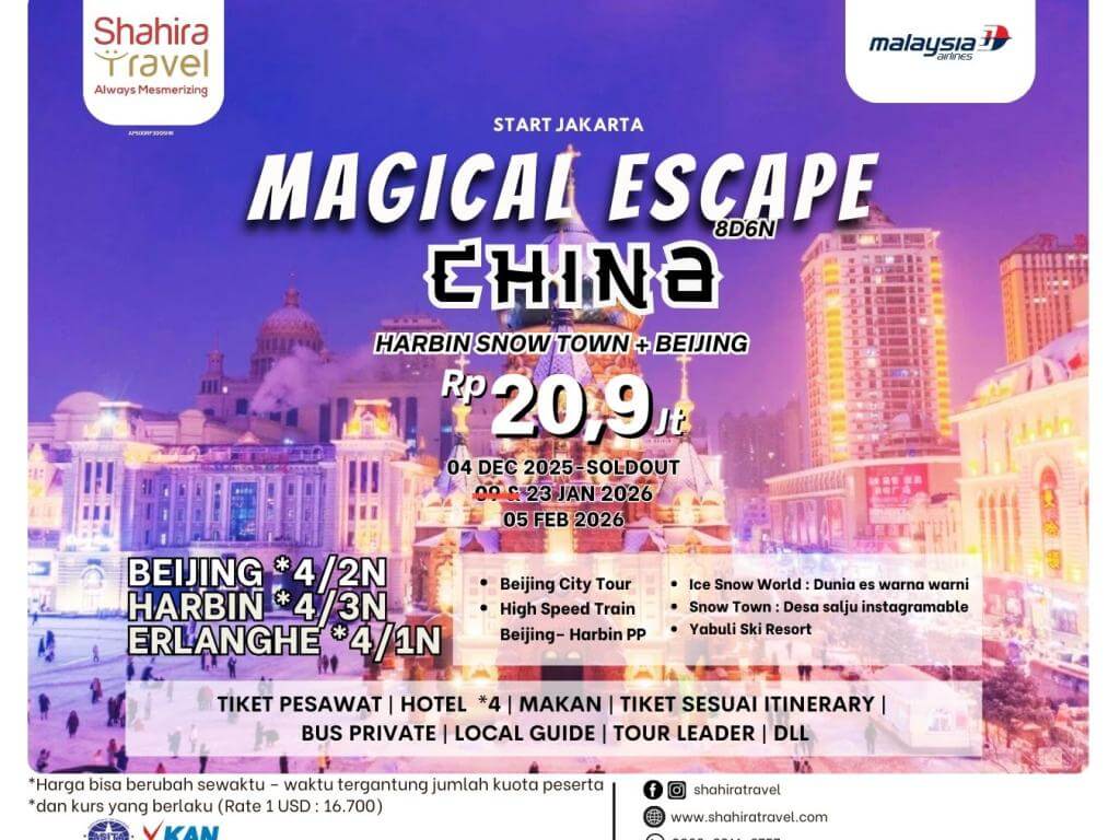- Group akan diberangkatkan apabila mencapai jumlah minimum peserta. Jika kurang dari minimum peserta, Shahira Travel berhak melakukan penyesuaian harga tour / mengganti tanggal keberangkatan / membatalkan keberangkatan.