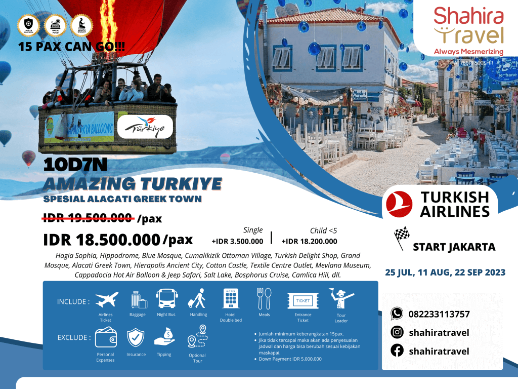 Hagia Sophia, Hippodrome, Blue Mosque, Cumalikizik Ottoman Village, Turkish Delight Shop, Grand Mosque, Alacati Greek Town, Hierapolis Ancient City, Cotton Castle, Textile Centre Outlet, Mevlana Museum, Cappadocia Hot Air Balloon & Jeep Safari, Salt Lake, Bosphorus Cruise, Camlica Hill, dll.