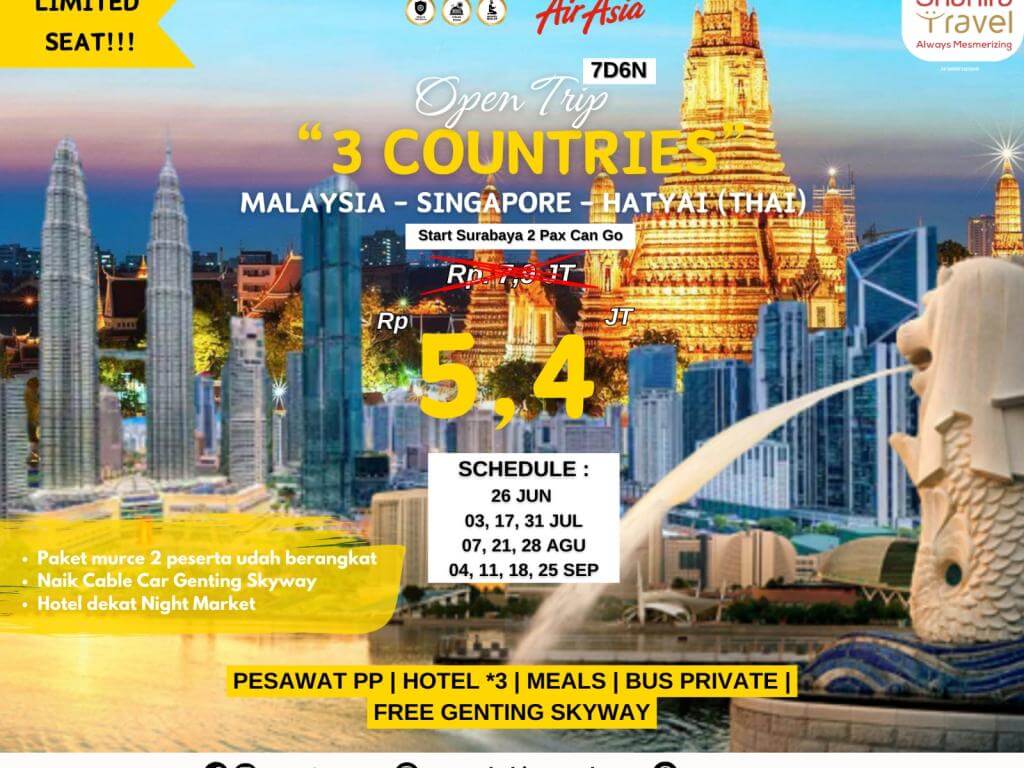 Genting Highland (cable car/gondola), Putrajaya (Photostop), Rumah Merah (Photostop), Universal Studio Singapore (Photostop), Merlion Park (Photostop), Garden by The Bay (Photostop), Jewel Changi (Photostop), Dataran Merdeka (Photostop), Istana Raja (Photostop), Twin Tower (Photostop), Rumah Coklat, Batu Caves (Photostop), Shopping khas Malaysia, Wat Huathanon (Photostop), Sleeping Budhha (Photostop), Pantai Samila, Shopping at Kayshorn
